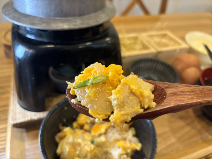 釜の底には香ばしいおこげもできており、食感と風味のアクセントになっています。調理という体験と出来立てを食べる幸福感が合わさり、親子丼という身近な料理が特別な一皿に感じられる時間でした。