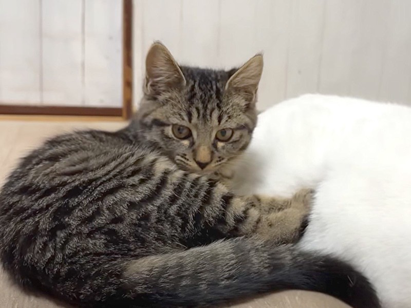 夜は先住白猫ミルクくんと寄り添って過ごしたというアズマくん。まるでアズマくんをじゃらすかのように真っ白な尻尾を振るミルクくんと、楽しげな様子でミルクくんの尻尾を追うアズマくんの姿があったといいます。