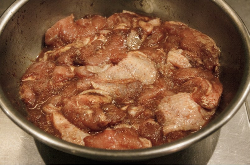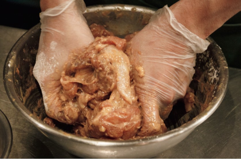 ボウルに衣以外の材料を合わせて、肉に揉み込み、冷蔵庫で1時間以上置く。別のボウルに衣の粉類を入れて混ぜ合わせておく。