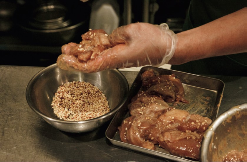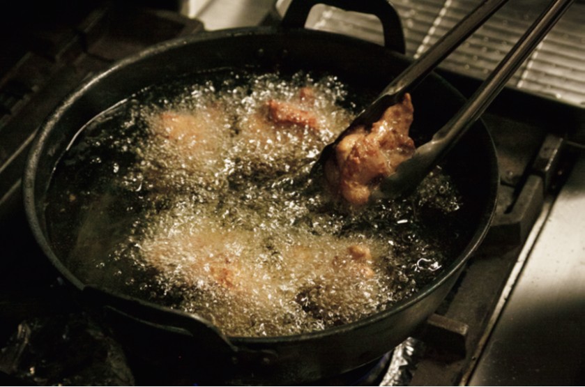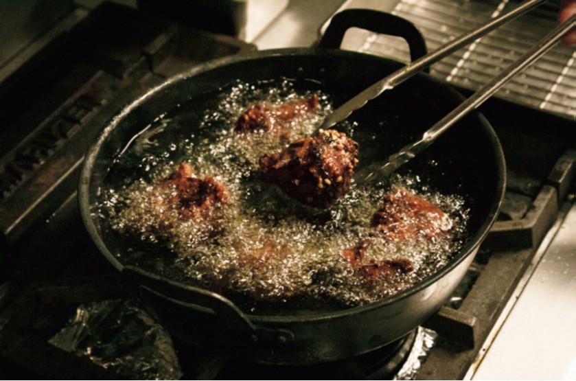 揚げ温度は180℃で2~3分。1分休ませ、200℃以上2度揚げに。「肉に下味がしっかりついているので、高温で長く揚げると焦げやすい。余熱で火を入れ、再度揚げ固めます」。さらに、衣の表面に炒り米をまぶし煎餅のような香ばしいアクセントを加えた。