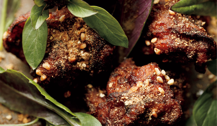 スパイシーなマリネ液に浸けた唐揚げ。中はジューシー、外側はカリカリした質感を目指した。仕上げにシナモン、花山椒、クローブ等をブレンドした自家製五香粉を纏わせて。