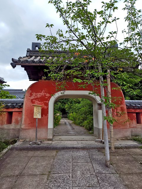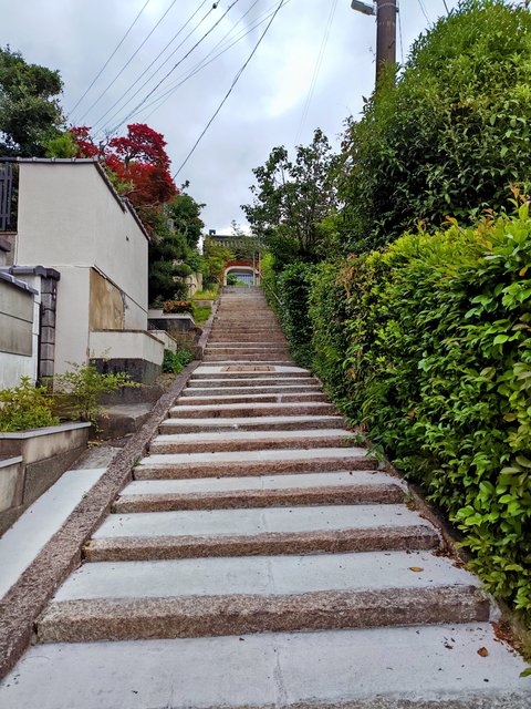 民家に挟まれたゆるやかな石段の先には独特な竜宮門が見えます。