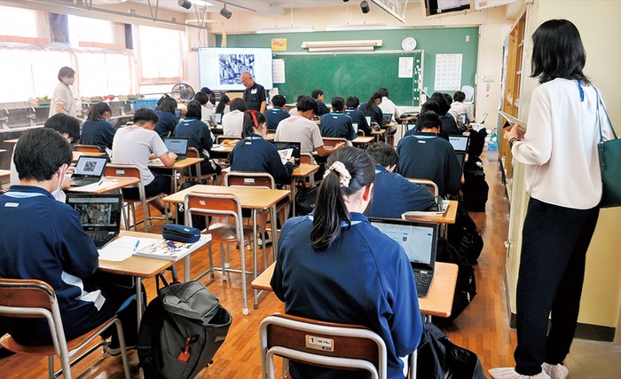 市立鴨居中学校(長島和広校長)で10月2日、公開授業が実施され、全国から多数の教員らが来校した。今年度「情報活用能力を高める授業の探索〜『主体的・対話的で深い学び』をめざして〜」をテーマに授業改善に取り組んでいる同校。昨年度に続き、文部科学省の「リーディングDXスクール事業」の指定校となっており、来校者たちはICT(情報通信技術)を駆使した授業の好事例として見識を深めた。