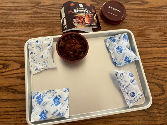 アイスなので溶けないよう、食品バットの上に保冷剤を敷いて簡易的な作業台を準備。(意味があるのかは謎)