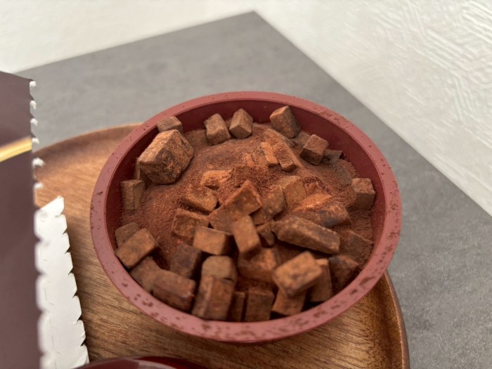 スッととろけて、濃厚なカカオの香りが一気に広がる。ほろ苦いココアパウダーとまろやかな甘みのバランスが絶妙で、これだけで単品商品として成立するクオリティだ。