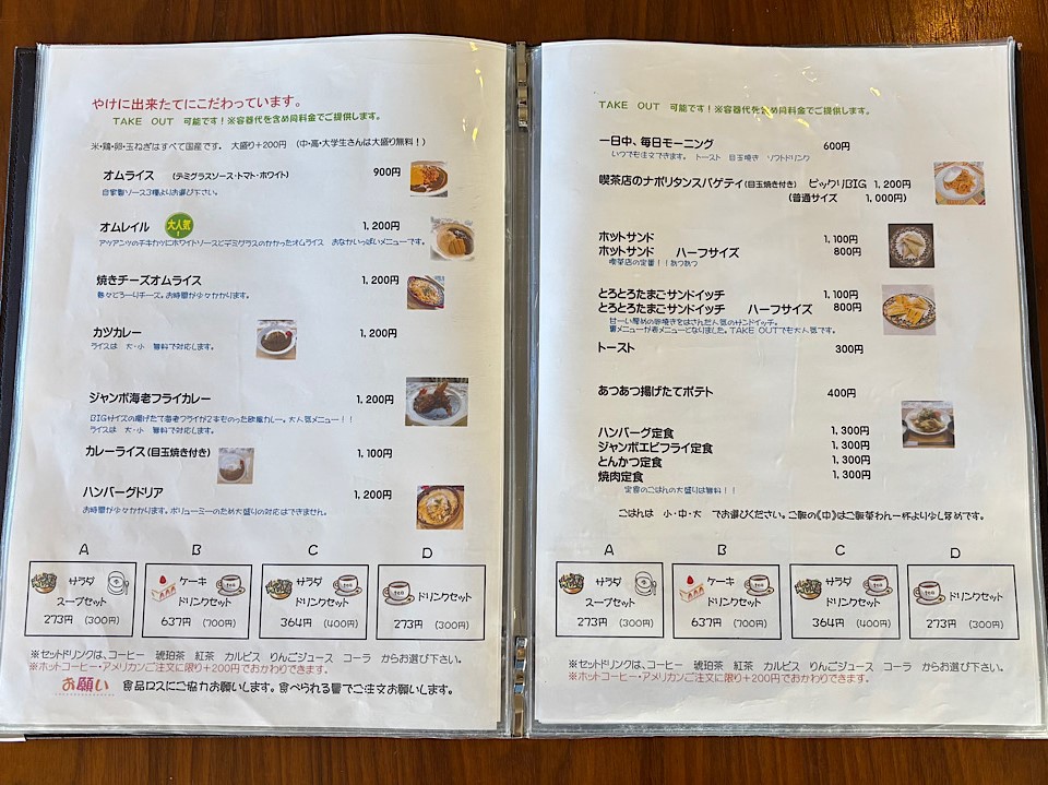 「一日中、毎日モーニング」というメニューは、トースト・目玉焼き・ソフトドリンクがセットになったモーニングセットで、その名のとおり、朝限定ではなく、何時でも注文できます。