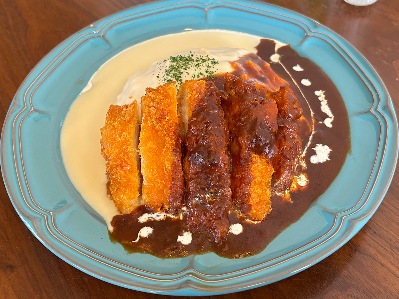 デミグラスソースとホワイトソースのあいがけで、揚げたてのチキンカツがトッピングされたオムライスです。