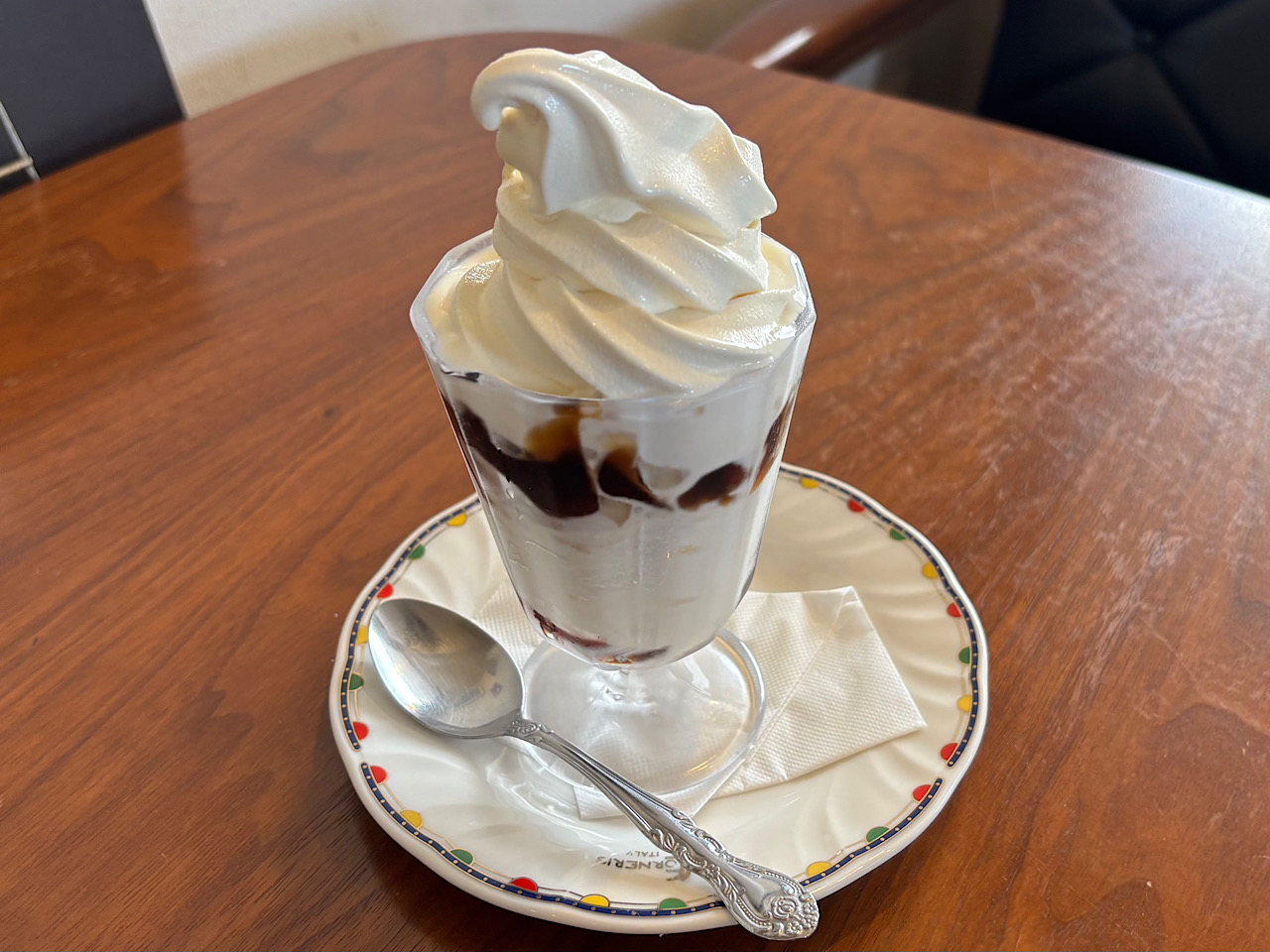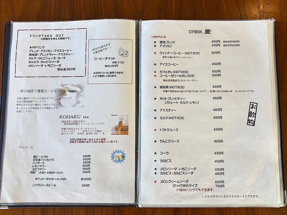 中華麺をうどんのだしと合わせた新湊名物「かけ中」や自家製のほろ苦いコーヒーゼリーとソフトクリームがたっぷりの「コーヒーゼリーソフト」も人気です。