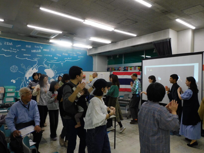 ボーさんが日本語でタイの地理や習慣、祭りなどを紹介した後、民族舞踊を体験する時間も設けられ、参加者は手の動きや姿勢をまねながら、異国のリズムを楽しんだ。