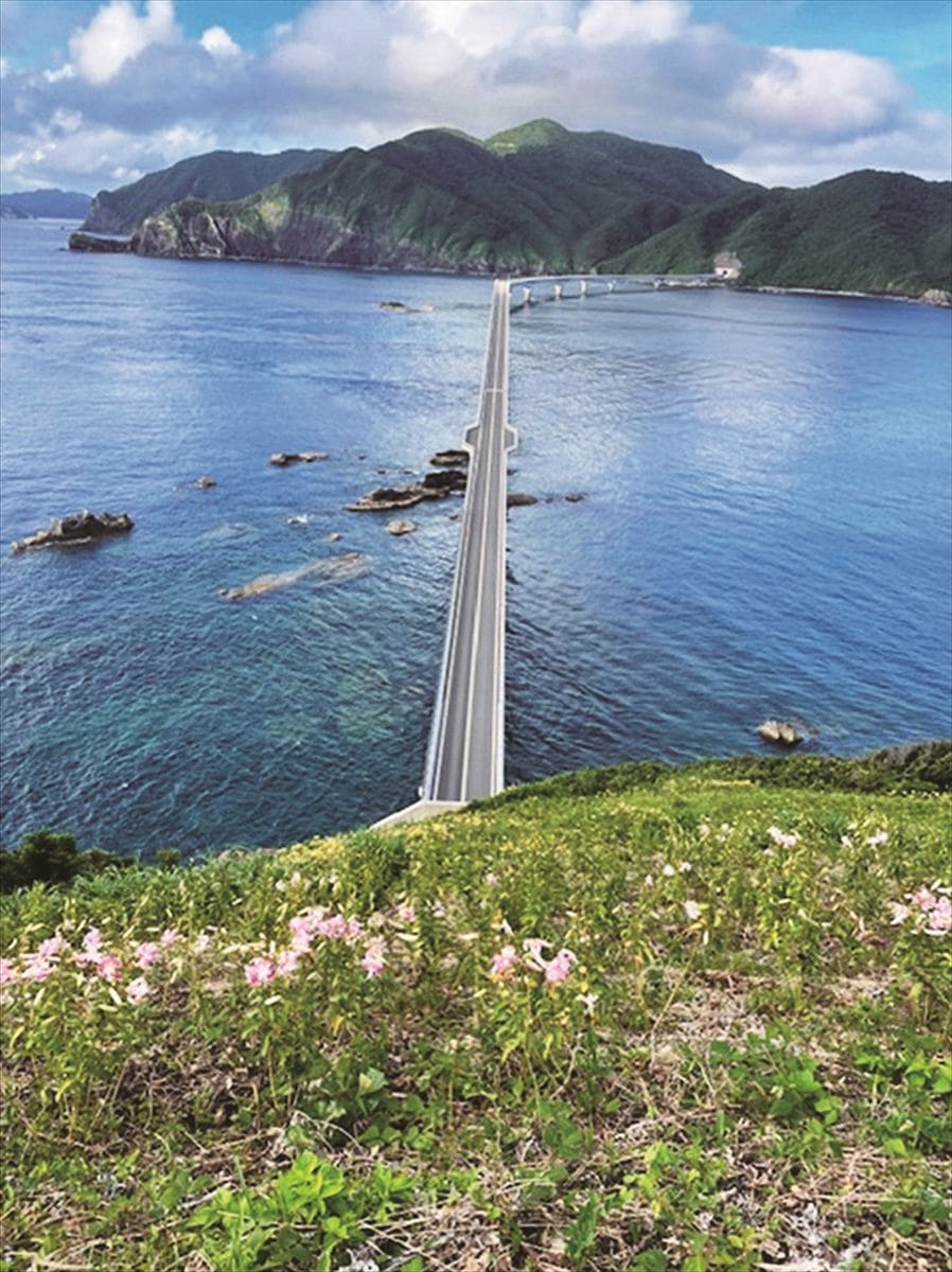 鹿児島県本土から西へ約30km、東シナ海に浮かぶ甑島列島は、上甑島・中甑島・下甑島からなり、最南端にあたる下甑島は断崖や険しい山が続き、その狭間に小さな集落が存在する。写真は、中甑島と下甑島を結ぶ甑大橋。鹿児島県本土の川内港から下甑島・長浜港へ高速船(1日2便)で約70分、串木野新港からフェリー(1日2便)で約105分。