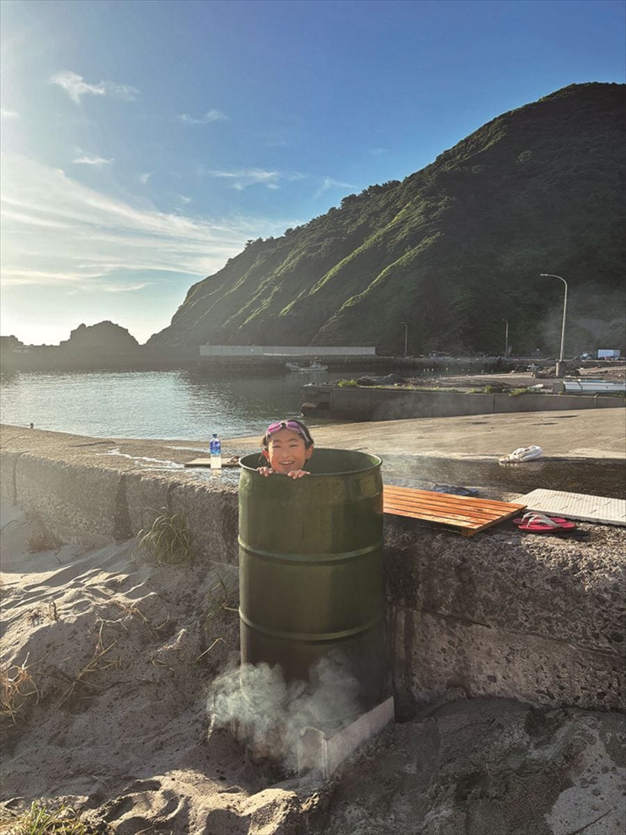 澤さんがつくったドラム缶風呂。あちこちに移動して楽しんでいる。写真は片野浦。