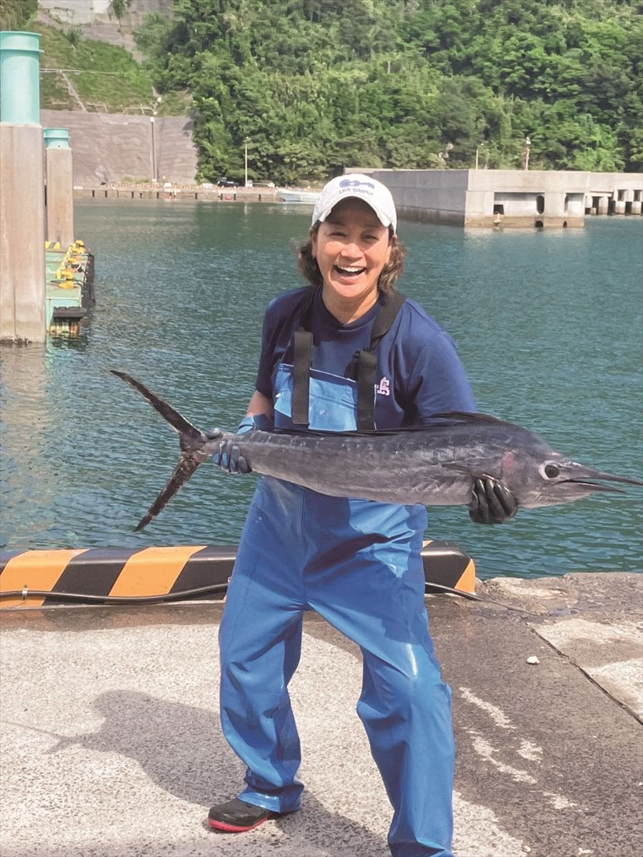 毎年秋、下甑島に回遊してくるバショウカジキの赤ちゃんを持つ澤さん。