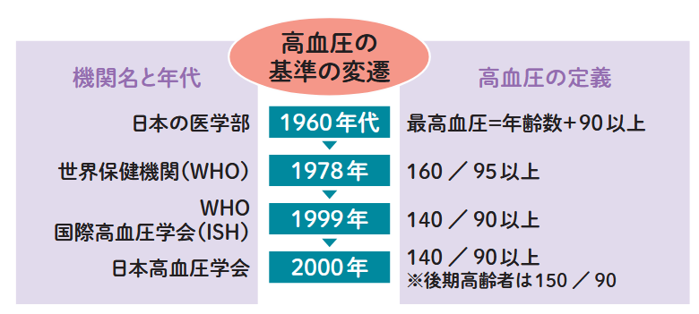 60年代後半に医学部で使われていた『内科診断学』では、平均血圧の算出法を「最高血圧=年齢+90」と制定。世界保健機構(WHO)も78年の段階では160/95以上を高血圧と定めています。ところが99年、WHOと国際高血圧学会(ISH)は、数値を140/90に引き下げました。日本高血圧学会もこれに続き、140/90以上を高血圧と制定、降圧の目標数値も130/85に引き下げたのです。