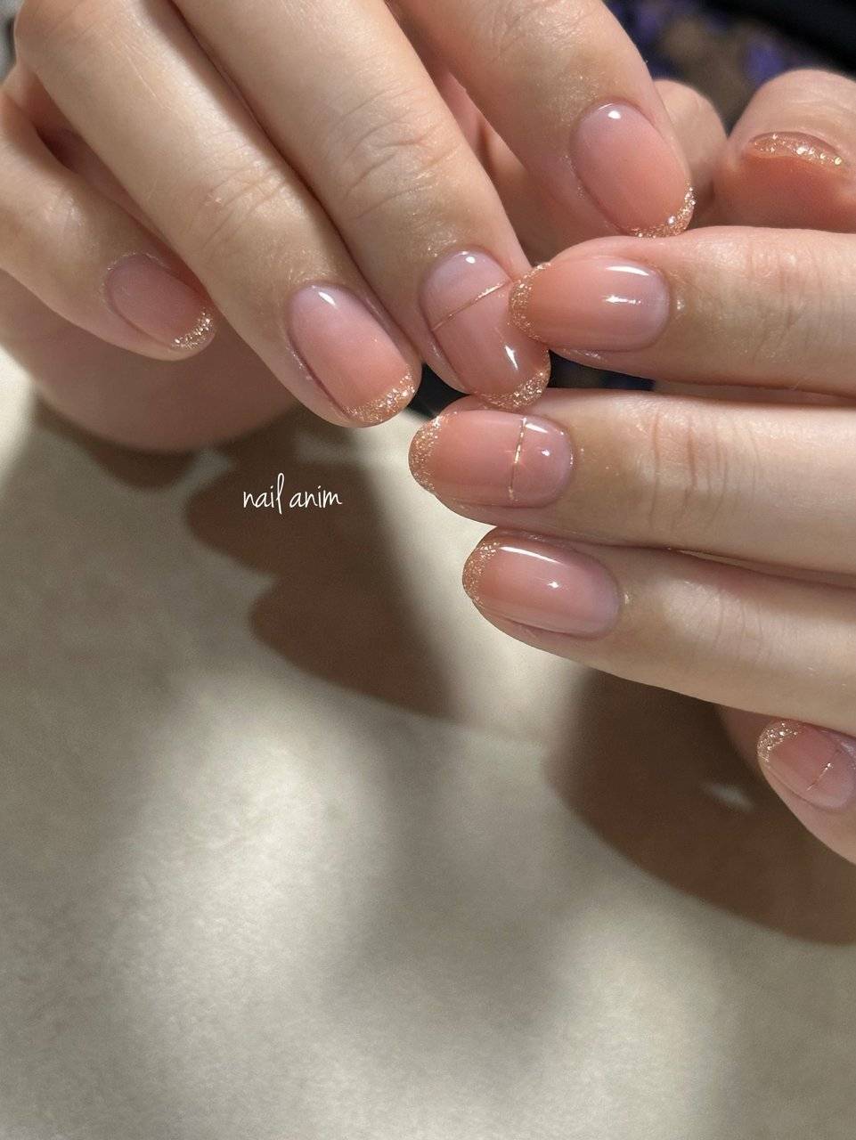 オレンジベージュのグラデーションを作ったら、相性の良いゴールドラメを爪の先端に入れてみましょう!
