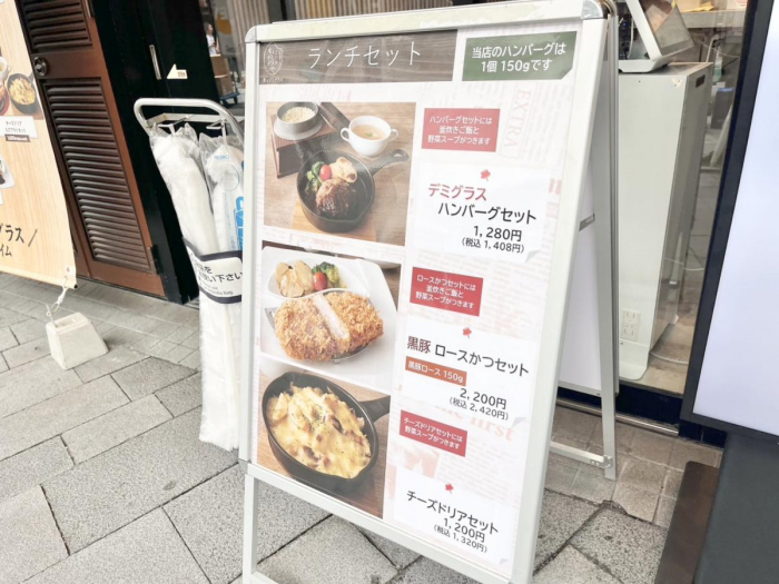 店頭に掲げられた「ハンバーグ×とんかつ」の大きな看板と、美味しそうな写真付きメニューが目を引き、つい足を止めてしまいます。