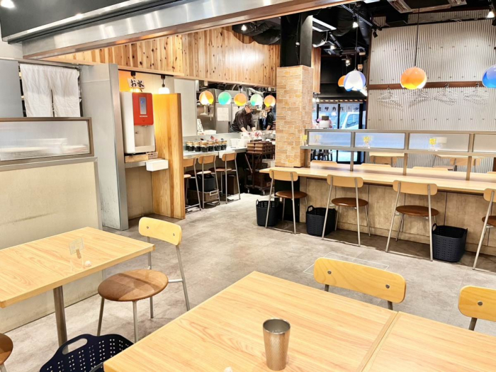 賑やかな通りにありながら、店内は明るく清潔で落ち着いた空間。カウンター席もテーブル席もあり、ひとりご飯からグループ利用まで幅広く利用可能です。