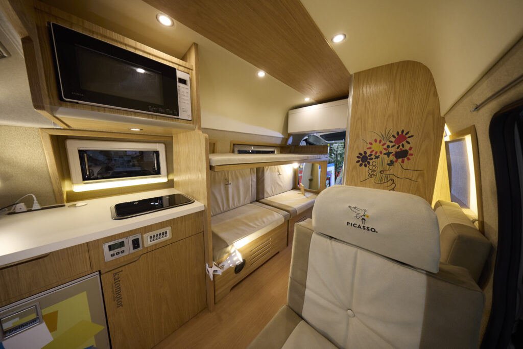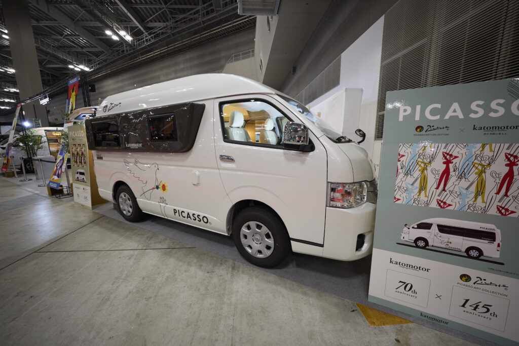 PABLO PICASSO生誕145周年とkatomotor創業70周年を記念して生まれた特別モデルが注目されていました。限定5台ということで、その希少性も高いのですが、インテリアにピカソの絵画をイメージしたグラフィックがインテリアに描かれており、他のキャンピングカーと明らかに違う雰囲気を感じます。