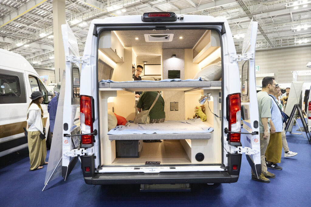 なかでも来場者の目を引いていたのが、リアの二段ベッド。キャンピングカーで二段ベッドと聞くと、シングルが上下に2つというイメージですが、このブルージュはダブルベッドの二段ベッドになっています。4人家族全員が寝られるベッドが常設されているのです。