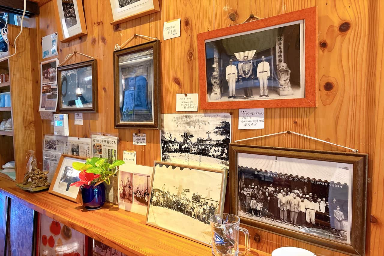 「真壁ちなー」を語るうえで欠かせない人物が、金城増太郎(きんじょう ますたろう)です。 金城増太郎さんは、現在「真壁ちなー」を切り盛りしている田中さんの曾祖父。店内の通路には、賞状や年季の入った写真がならび、金城増太郎さんの存在感を伝えています。 金城増太郎さんはもともと教員であり、戦時中・戦後を通じて元三和村の村長を長く務め、村の発展に大きく貢献しました。さらに1957年から3年間は琉球政府立博物館(現・沖縄県立博物館)の館長も務め、沖縄史に精通していた人物です。 「真壁ちなー」は、かつて金城さんが居住していた場所。亡くなられたあとはしばらく空き家となっていましたが、家族はこの古民家に関心を持つ人がいると考え、当時のままの状態を保ち、軽食を提供する茶処として営業をはじめ、いまに至ります。