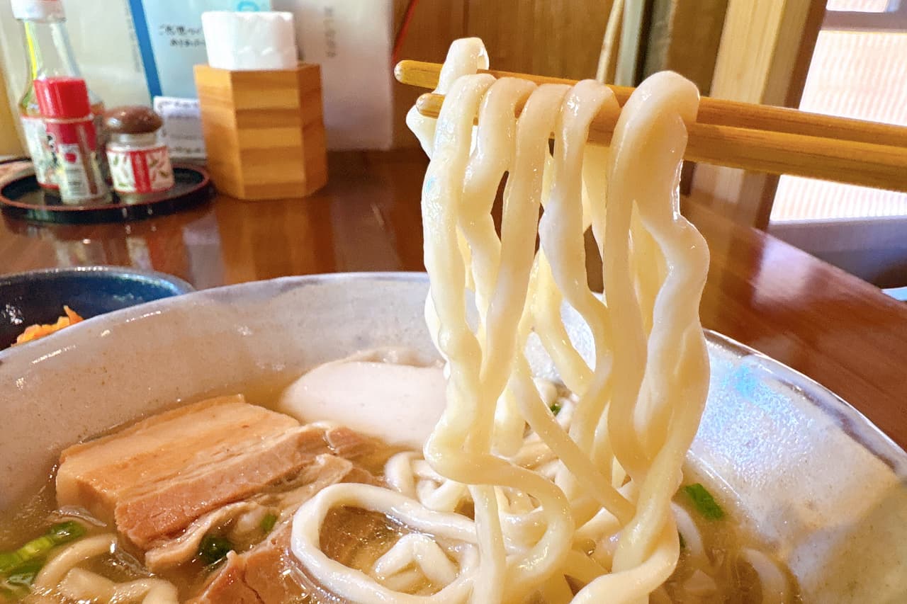 そば粉を使わずに小麦粉で作られた沖縄そばの麺の特徴は、なんといってもコシのある歯ごたえにあります! 「真壁ちなー」では、モチモチ感が特長の、西崎製麺所の麺を使用しています。縮れがかった波打つ形状は、ダシ汁をしっかりとまとい、ひと口ごとに麺のモチモチ感と歯ごたえ、そしてダシの旨みを同時に楽しめます。