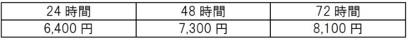 価格:24時間6,400円・48時間7,300円・72時間 8,100円