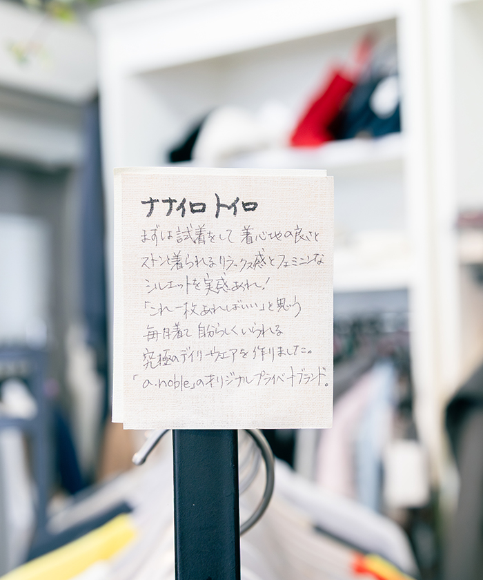 畠山さん:「ナナイロトイロ」の良さは、一度着ていただけたらわかっていただけると思います。気になる方は、気軽に「a.noble」に足を運んでもらえたら嬉しいですね。オンラインでも販売していますし、返品保証もついているので、気になった方はぜひお試しいただきたいです。