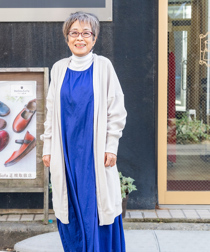 畠山さんのお母さんであり「a.noble」オーナーの残間さん。この日は青を差し色に、全身「ナナイロトイロ」でコーディネートしていました。