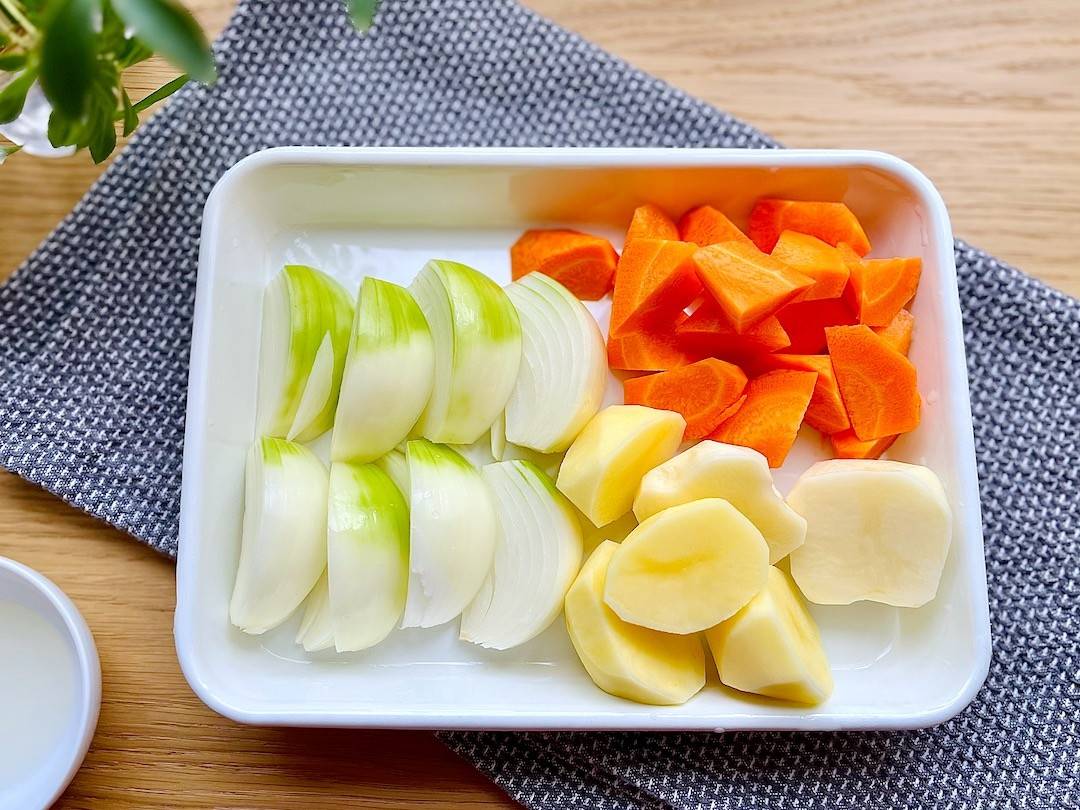 すべての材料をカットしておきます。煮崩れしやすいじゃがいもはやや大きめに、玉ねぎはくし切り、にんじんは乱切りにしましょう。