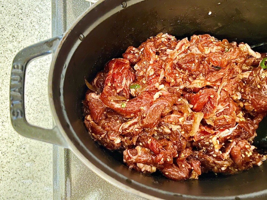 厚手の鍋にプルコギを入れ、色が変わるまで炒めます。コストコの「プルコギビーフ」は十分な脂を含んでいるので、鍋に油はしかず、ダイレクトに炒めてOKです。弱めの中火でゆっくりと火を入れていくうちに、じわじわと脂がでてくるのが分かりますよ。