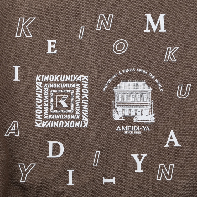 表面には紀ノ国屋と明治屋それぞれのロゴやアルファベットがおしゃれに散りばめられており、裏面には「MEIDI-YA × KINOKUNIYA」の文字が印象的にデザインされています◎
