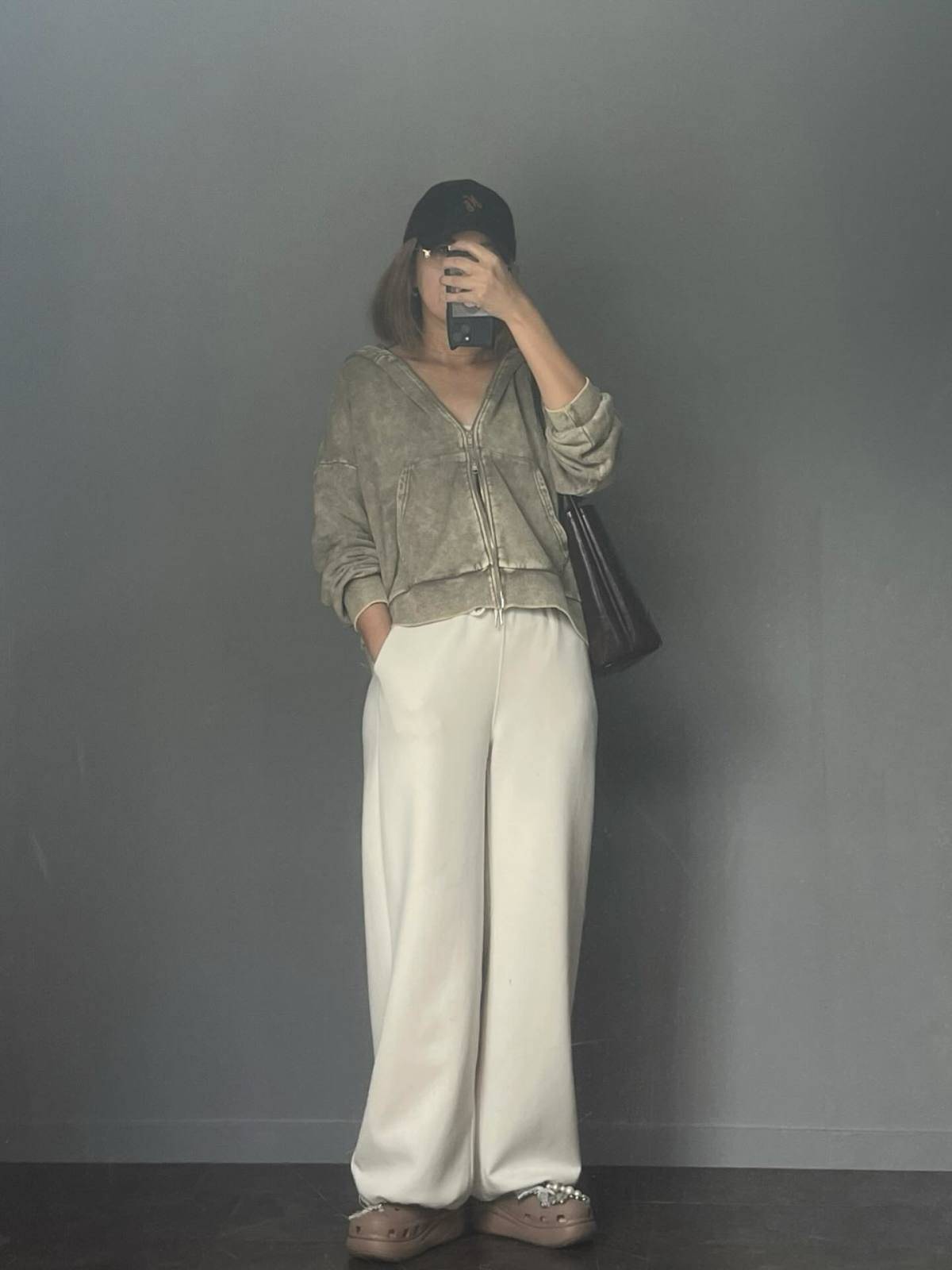 ボトムスに白のスウェットパンツを合わせれば、カラーコントラストのおかげでダサ見えしません♡