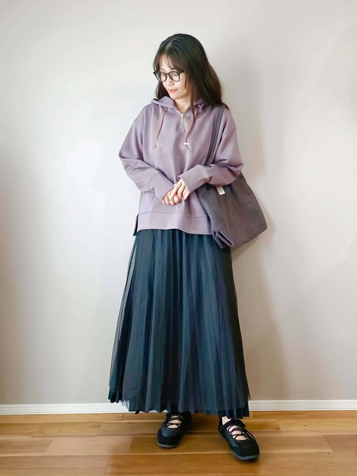 【11月編】ダサ見えしないパーカーコーデ①サイドスリットパーカー×プリーツスカート