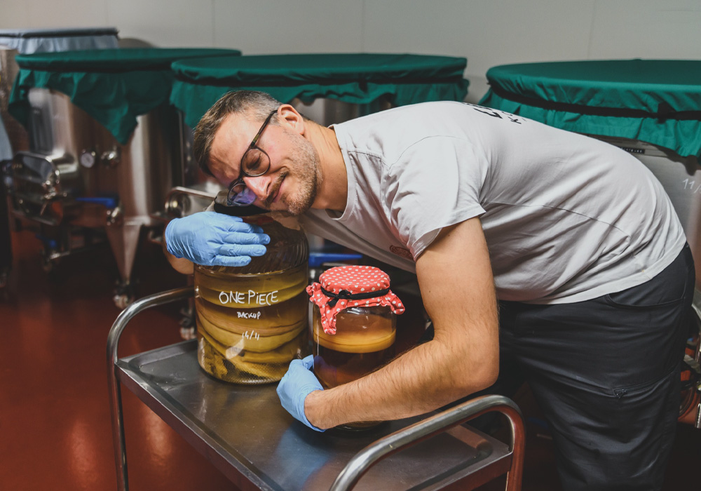 コンブチャの素になるスコビー(種菌)は発酵の良し悪し、味が決まる大事なもの。もともとコンブチャや発酵食品を作っていたエットレさんの宝を大切に繋いでいる醸造担当のスタッフ。