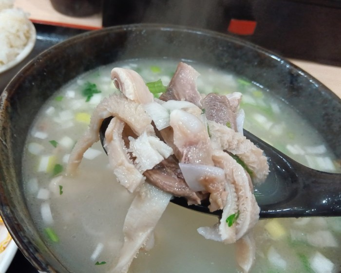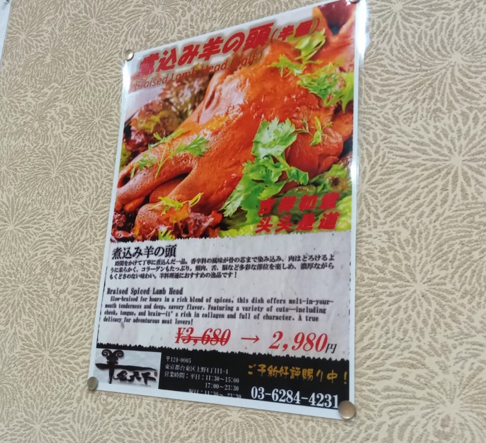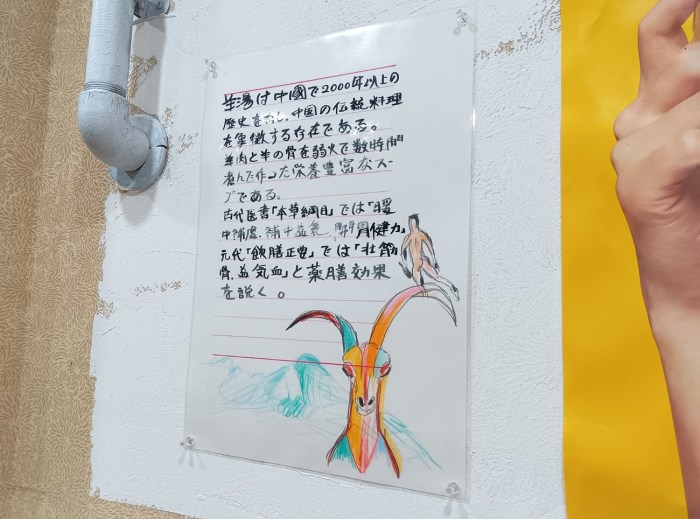 店内に貼られていた説明によると、羊肉、骨を数時間煮込んで作るスープで、中国の伝統料理を象徴する存在なのだそうな。ディープさにアメ横を感じる。