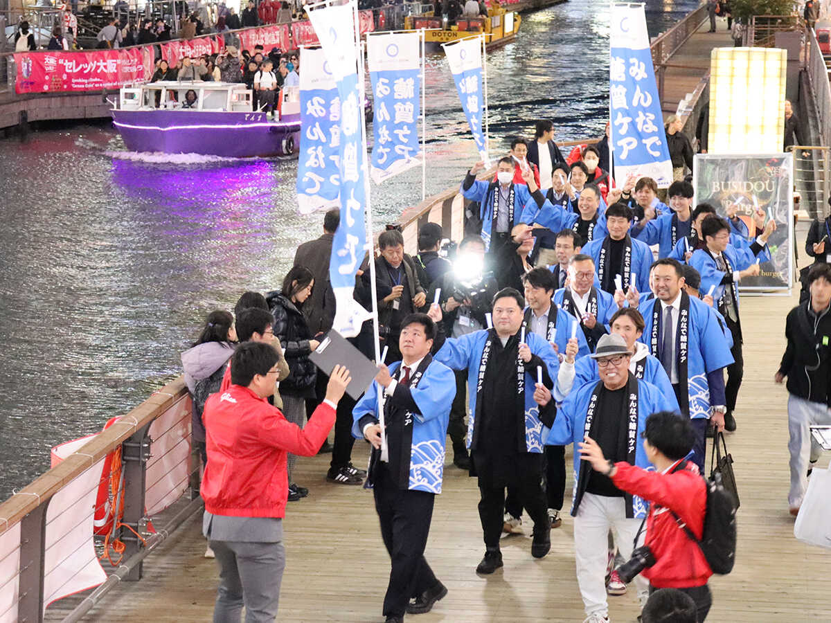 道頓堀商店会・大阪府・なんばマルイ・江崎グリコは11日から、糖質を意識した健康習慣「糖質ケア」をテーマにした啓発活動を、11月14日の「ワールドダイアベティスデー(世界糖尿病デー)」に合わせて展開。11日には、道頓堀エリアの関係者が世界糖尿病デーのシンボルカラーであるブルーを身にまとい、道頓堀川沿いを練り歩き、川沿いをブルーに彩るライトアップする健康啓発の取り組みを行った。