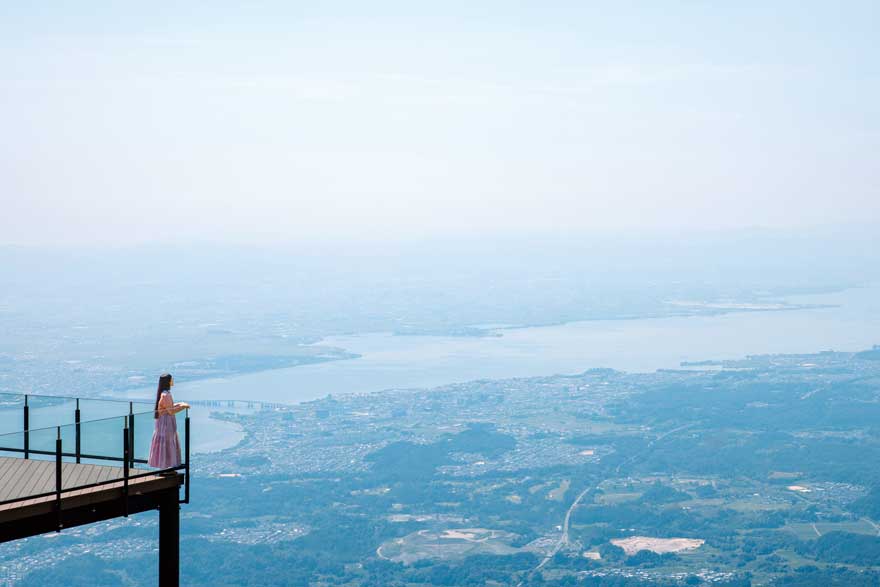 「びわ湖バレイ」に設置された展望エリア「びわ湖テラス」からは、琵琶湖の全景のみならず北アルプスまでもが見渡せます。園内にはレストランやカフェも併設。絶景とともに味わいたいオリジナルグルメも必見です。