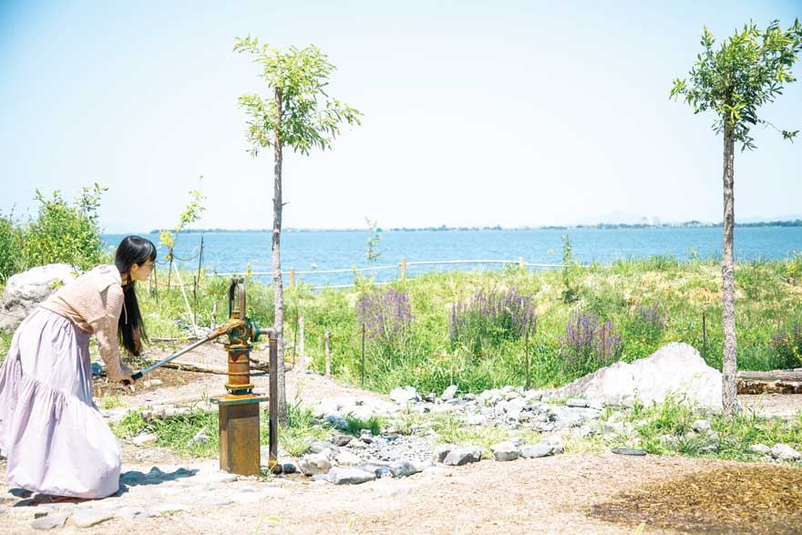 「琵琶湖の森」は、近江地方に自生する樹木を市民とともに植樹して作られた森です。四季によって移り変わる約400種類の植物が植えられています。「ひかりの水辺」エリアでは、手押しポンプで水をくみ上げる体験ができます。流れた水は植物に循環されるそうです。