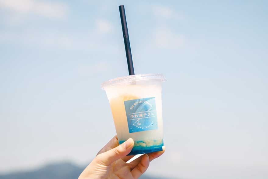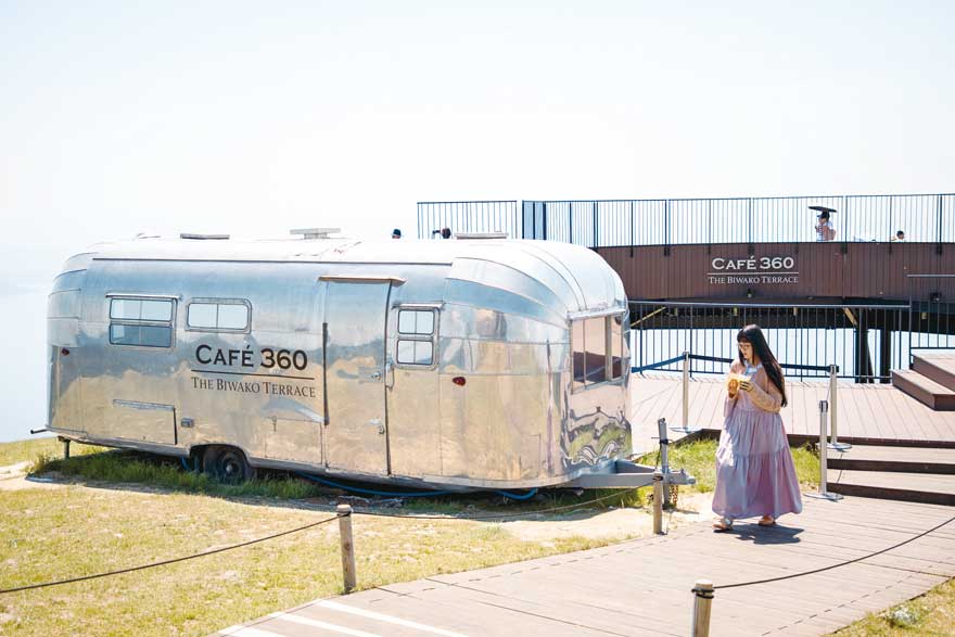 「LAGOカフェ」は、地元の名産品・近江牛入りのおこわや焼きたてのカステラ、ドリンクがそろっています。晴れた日は「琵琶湖」を一望できるテラス席がおすすめです。