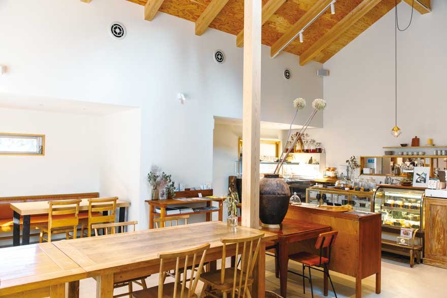 木材を再利用したテーブルや、グリーンが映える店内です。工房では職人がカステラを焼き上げる様子を見ることもできます。