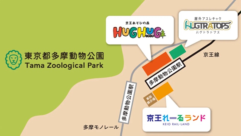 「京王れーるランド」「京王あそびの森 HUGHUG」「多摩動物公園」がある街全体を、大きな公園に見立てて「キッズパークたまどう」と命名。子どもが1日遊べるエリアとなっています。