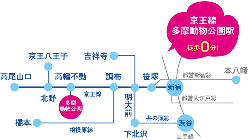 また、同駅前には2018年3月に全天候型の子ども向け遊戯施設「京王あそびの森 HUGHUG」がオープン。都内初の屋外アスレチックタワーや日本最大のキッズコースで遊べます。そして駅名の通り「多摩動物公園」もすぐ近く。多摩丘陵の起伏にとんだ地形と自然を活かし、自然に近い環境を再現。檻ではなく壕で仕切られた広い飼育場でのびのびと過ごす動物を観賞できます。