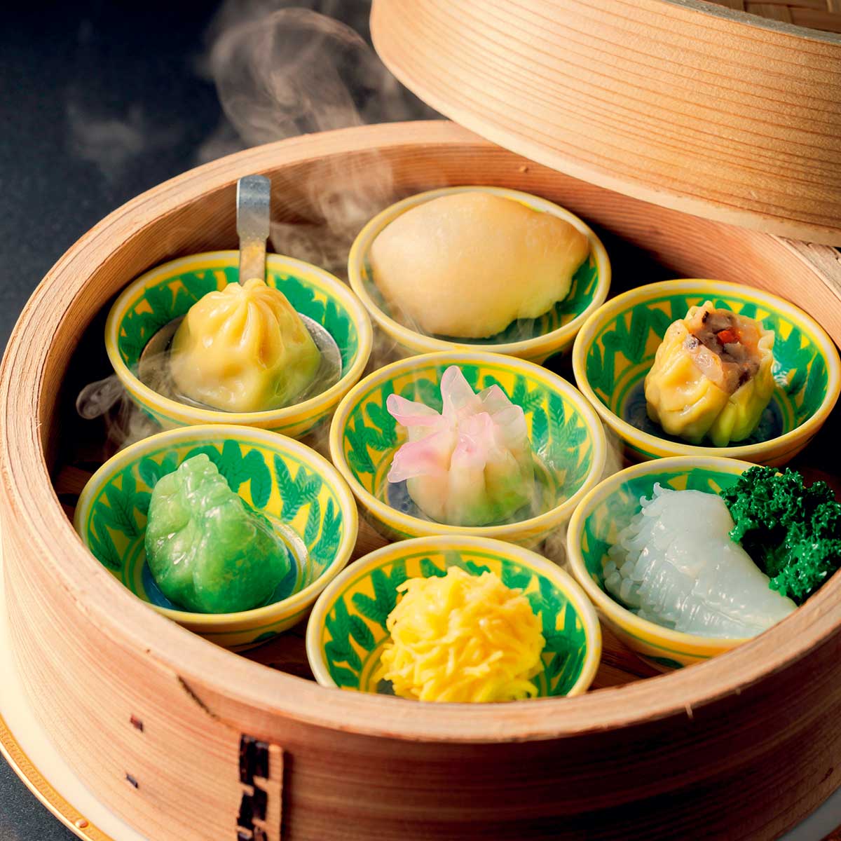 大きな蒸籠に翡翠色の餃子や花の形のシュウマイなど、目でも楽しめる点心7種を盛り合わせた、月替りのランチコース。