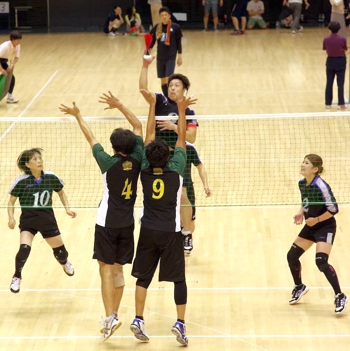 バドミントンネットをはさんで羽根付きのボールを手で打ち合う、バレーボールに似たスポーツです。