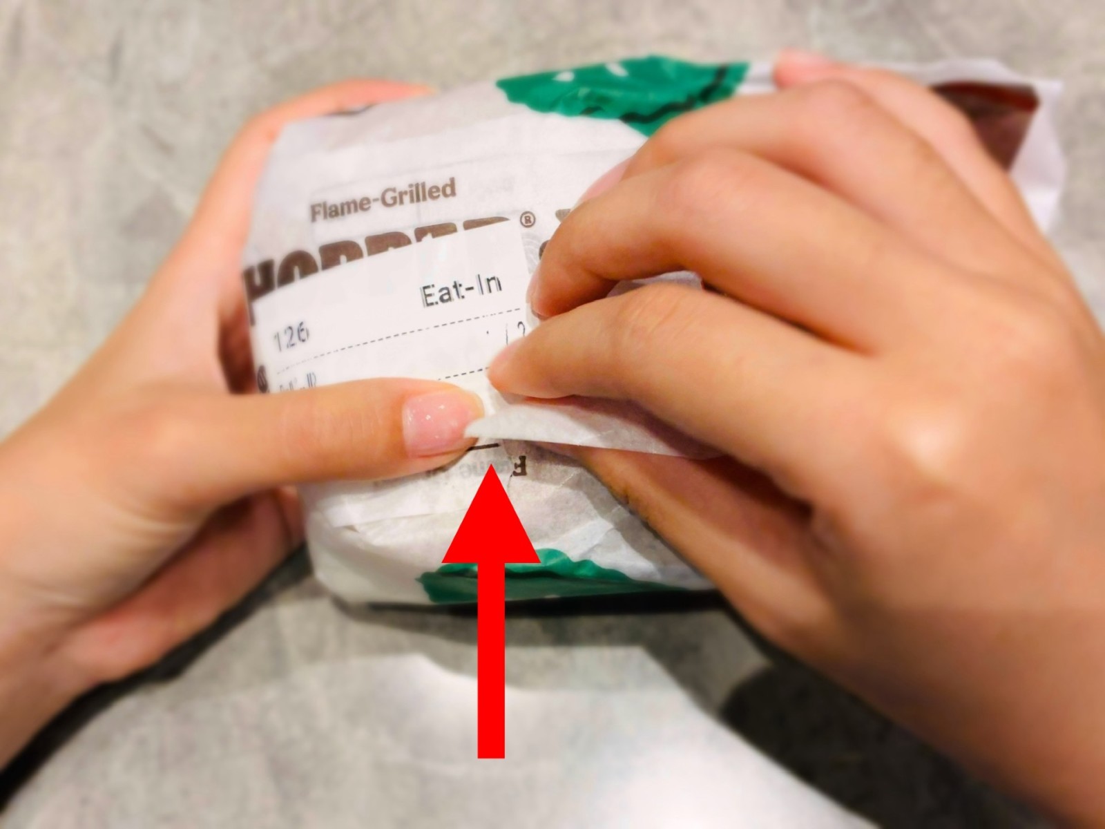 2.バーガー中央付近の包み紙の端をつまみます。
