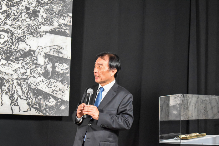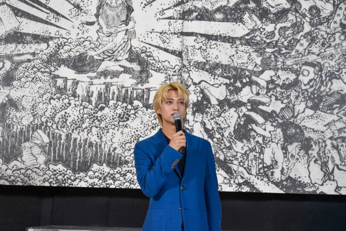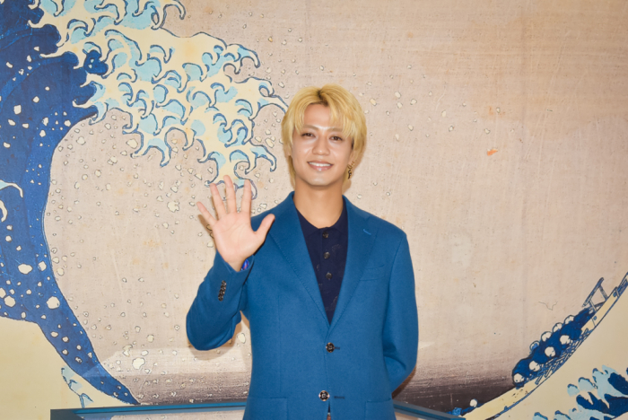 開幕に先立って開催されたメディアセレモニーでは、北斎が愛したベロ藍をイメージさせる青色のコーディネートで登場。浦上蒼穹堂の浦上満氏とも対談し、音楽活動や俳優の傍ら、特技の絵を活かしてアーティストとしても活躍する彼ならではの視点で展覧会の魅力を紹介した。