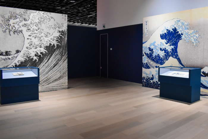 ここからは高橋や浦上氏のコメントを挟みながら、会場レポートをお届けしよう。最初に目に飛び込んでくるのは、現物を100倍にした巨大な絵。ここまで引き延ばしても力強さがまったく弱まらない、北斎の絵から伝わるエネルギーと技量に圧倒される。拡大した絵と現物、その両方を一緒に楽しめるのも面白い。