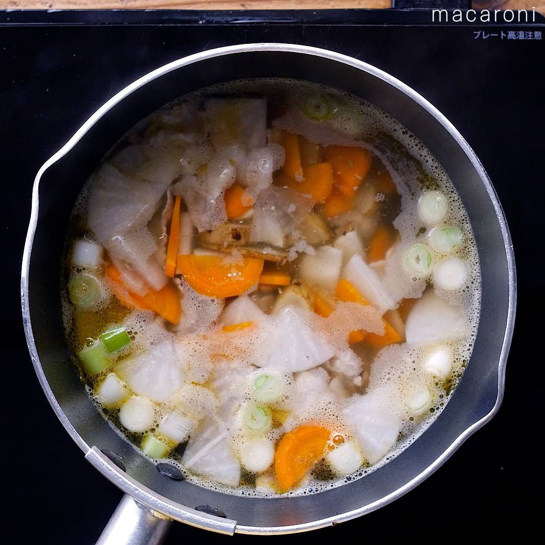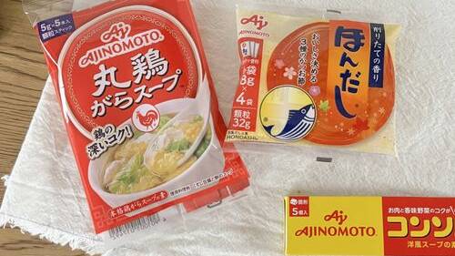 4: 水、だしの素を加え、ひと煮立ちさせます。