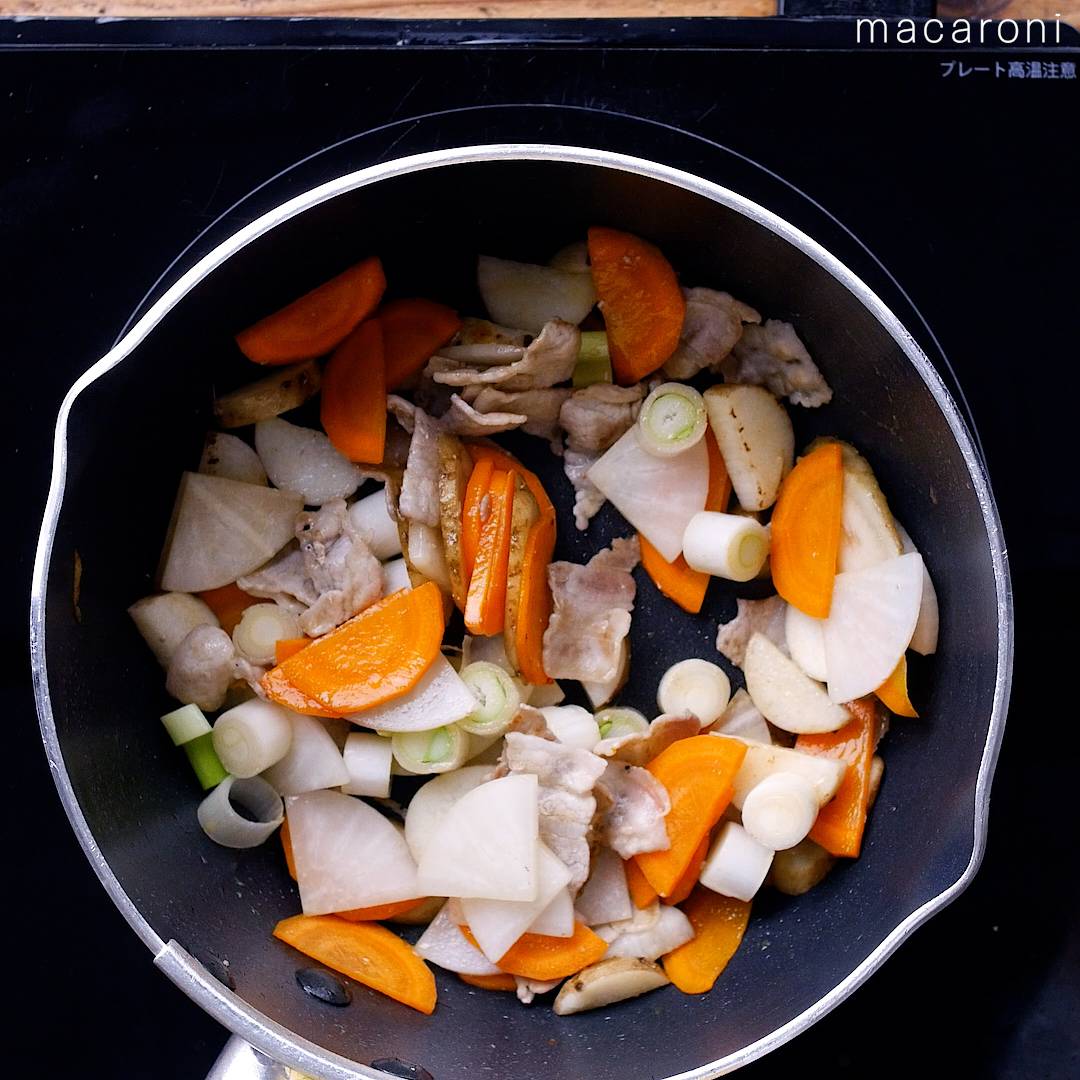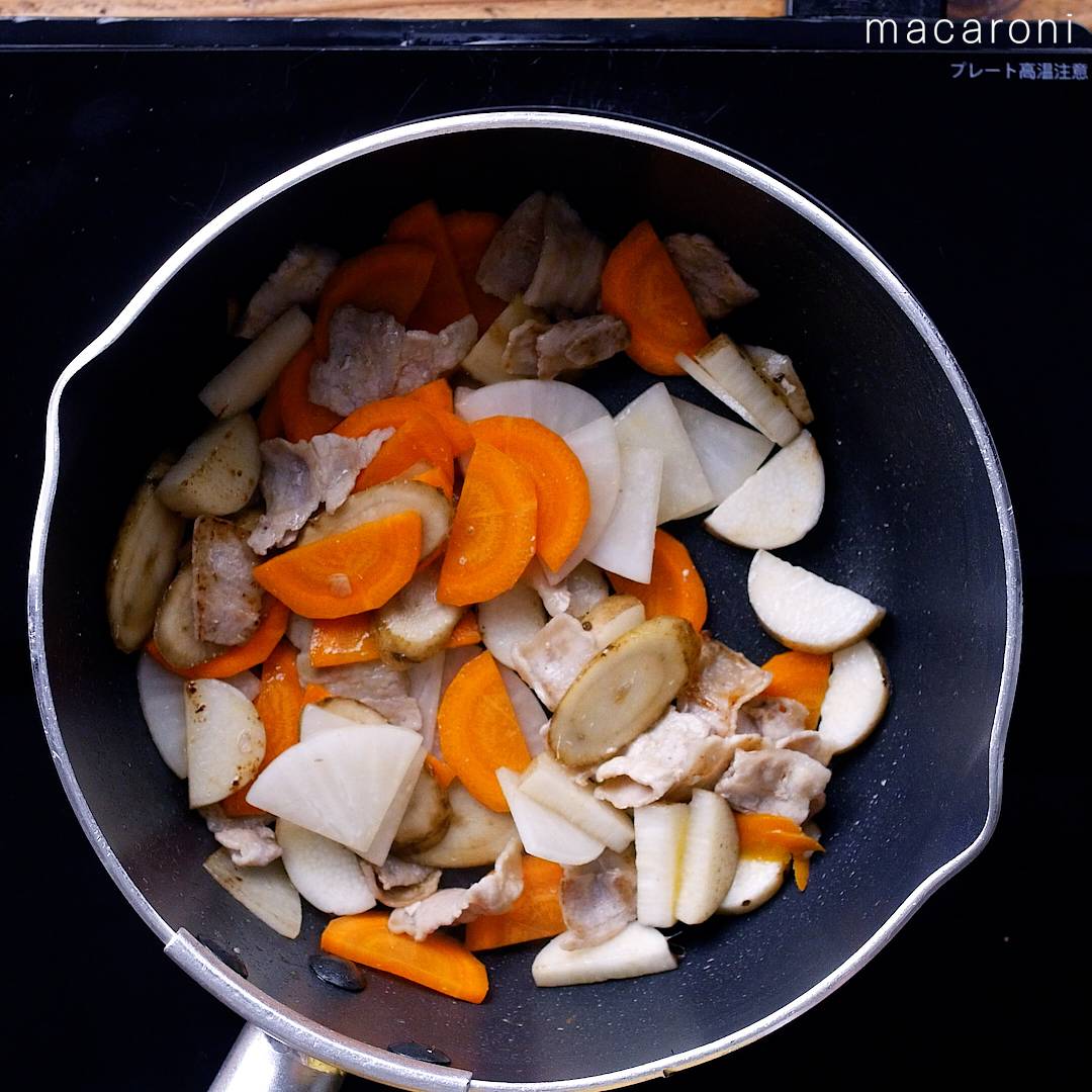 2: 大根、にんじん、長芋、ごぼうを加えて中火で1〜2分、大根が透き通るまで炒めます。