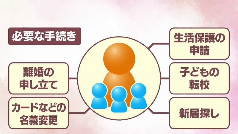 この間に、離婚の申し立て、生活保護の申請、子どもの転校、新居探しなど、その度にさまざまな窓口に足を運び、手続きが必要でした。