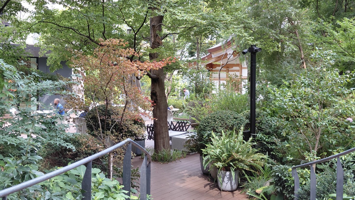 地形を活かした水の流れや散策路もあり、都会の喧騒を忘れリラックスできます。私が訪れた日は真夏日でしたが、木々が多いからか涼しく感じられ、緑を感じながらテラスでうたた寝している方もいました。思わずゆっくりしたくなる、心地よい場所です。